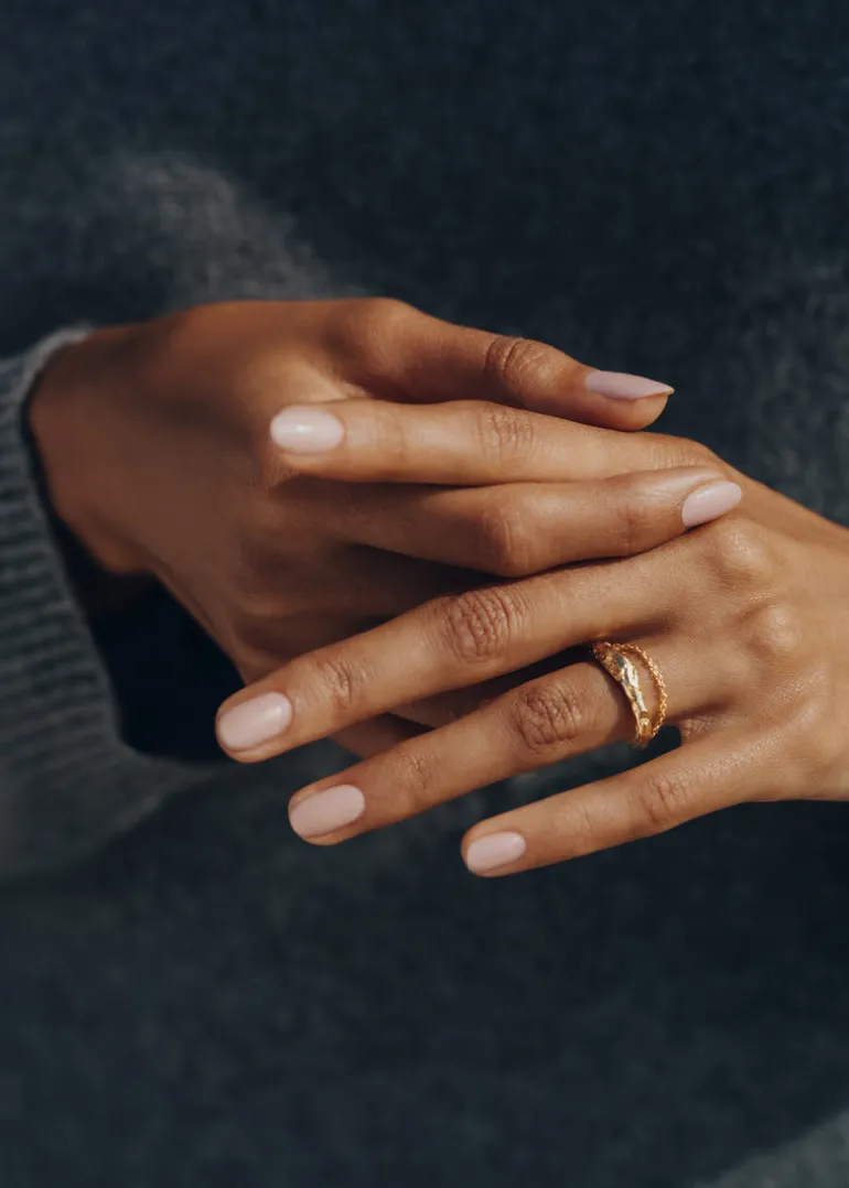 La bague chaîne Eroz réunit aspérités rocheuses et aspect lisse sur son anneau doublé d’une fine chaîne aux maillons délicats qui s’échappe sur le doigt.