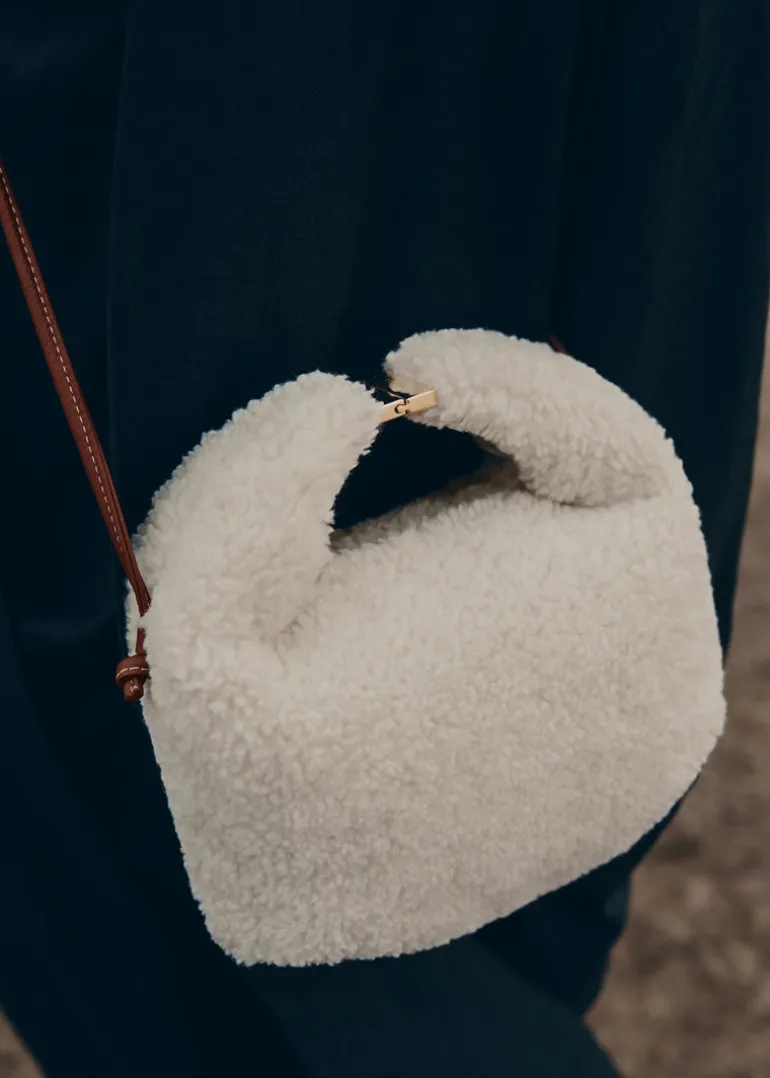 Réalisée à partir d’un tricot de fibres recyclées, l’édition bouclée du modèle Béri est réhaussée de finitions en cuir pour une allure duveteuse et sophistiquée. Le fermoir métallique, le travail de pli au-dessous du sac et la bandoulière composée de nœuds coulissants font toute la singularité de ce design fort et épuré.