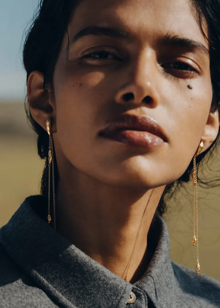 Des pépites dorées se mêlent aux maillons délicats des boucles d’oreilles chaînes Eroz. Une balance harmonieuse entre légèreté, fluidité et texture rocheuse.