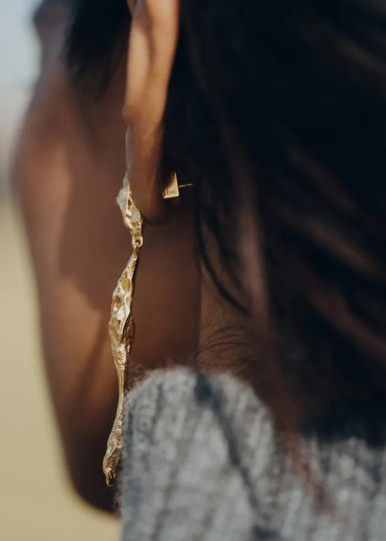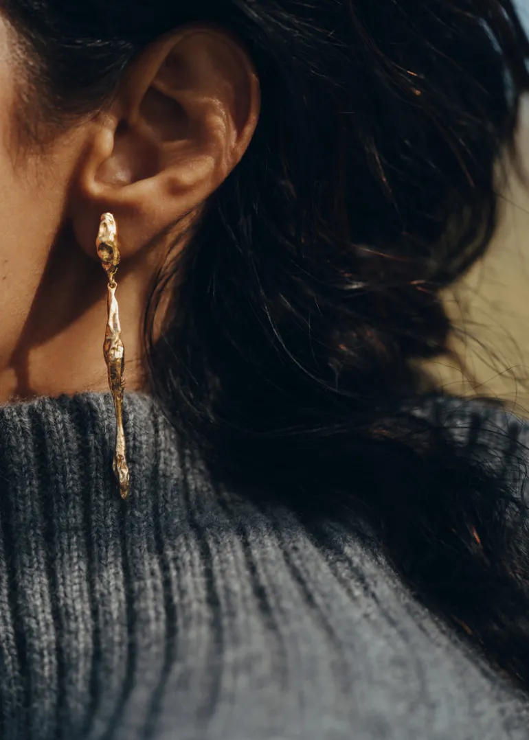 Les boucles d’oreilles pendantes Eroz évoquent une roche en fusion, recréée avec finesse.