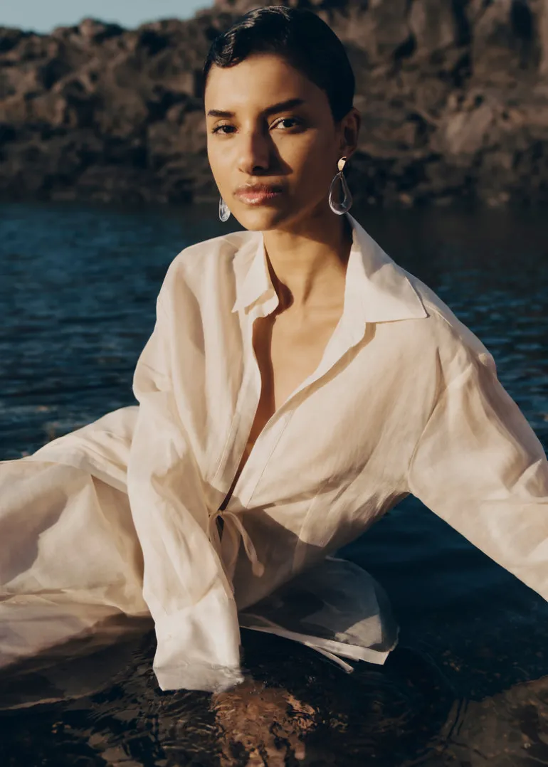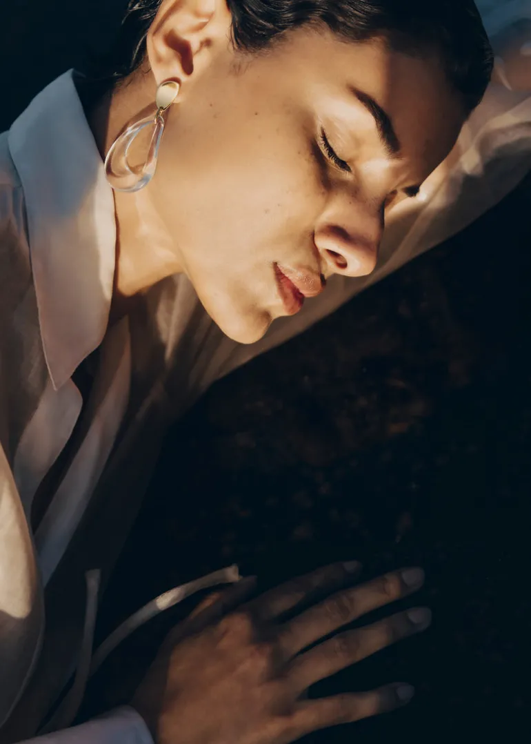 Deux gouttes d’eau délicatement sculptées dans le verre en forme de créoles habillent l’ovale du visage.