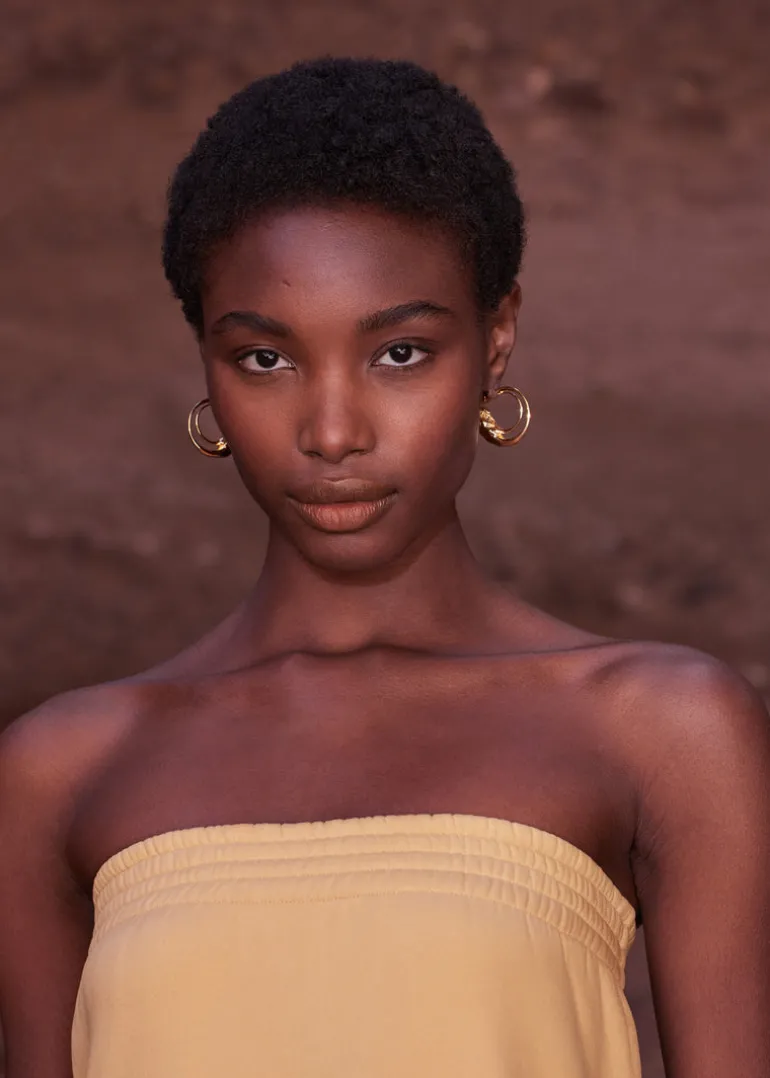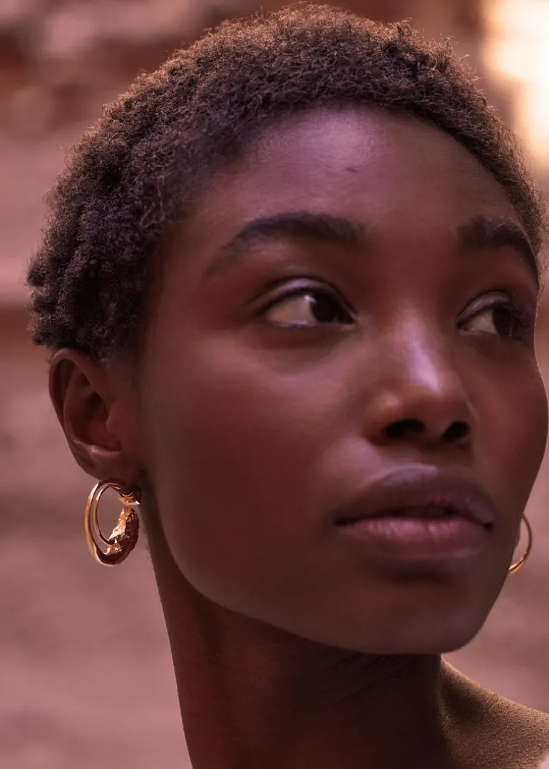 D’un seul tenant, les créoles Eroz passent de fils parfaitement polis à une texture de roche finement sculptée dans la matière.