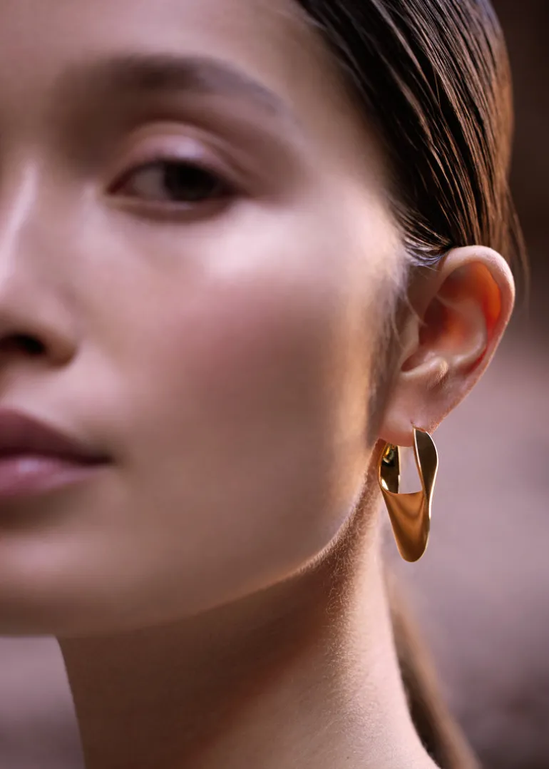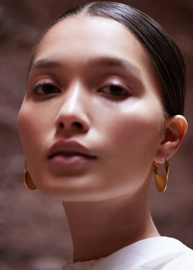 Les créoles Éole slim arborent une forme pleine et allongée qui vient subtilement habiller l’ovale du visage.