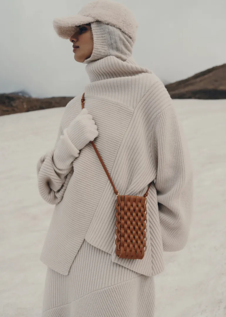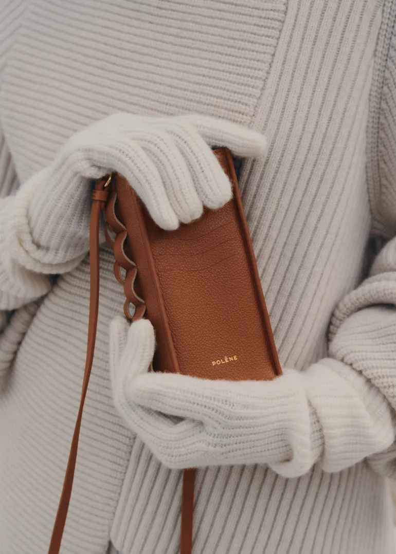 Pour donner corps à l’étui téléphone Onda, des bandes piquées s’alternent en quinconce, dessinant un relief faisant écho à une écorce de cuir ondulé. L’accessoire porté autour du cou ou en crossbody permet aussi d’y glisser des cartes.
