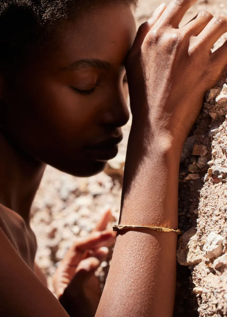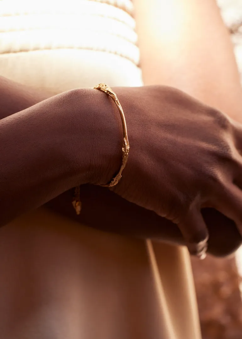La subtilité et l’élégance d’un jonc qui cercle délicatement le poignet. Son design arbore des aspects de roches naissantes qui parsèment la ligne fluide du bracelet.