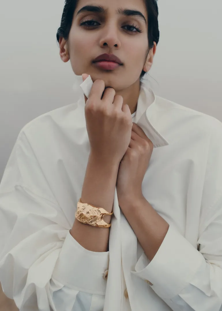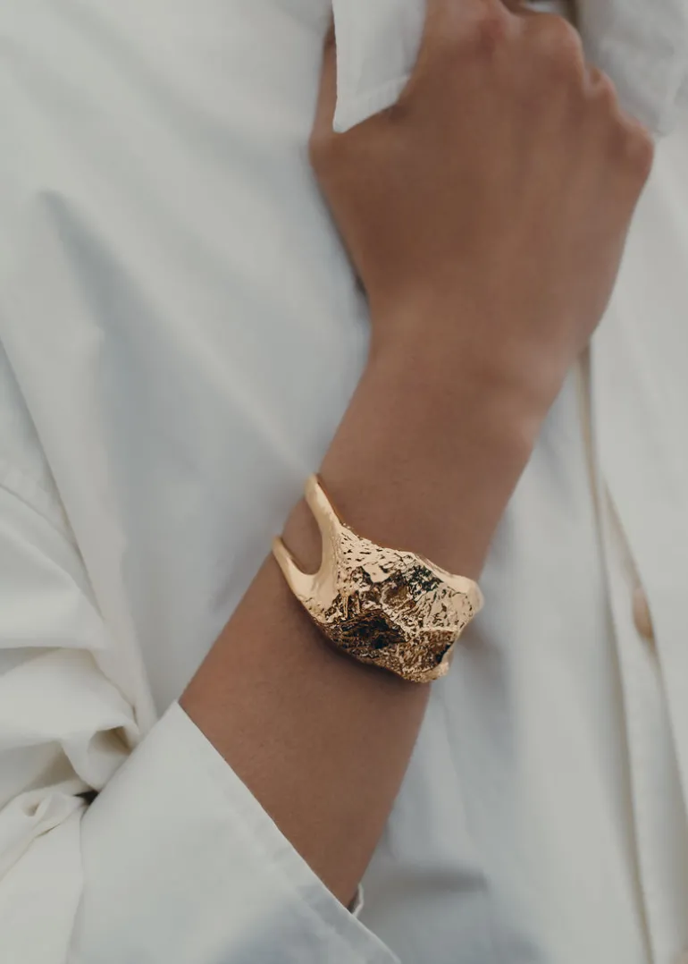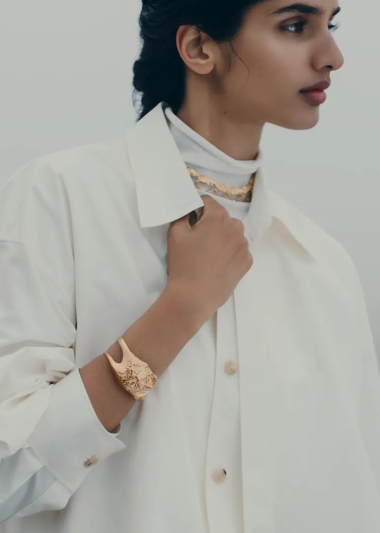 Autour d’un poignet, la forme rocheuse de la manchette Eroz contraste avec la fluidité de ses branches dédoublées et asymétriques.
