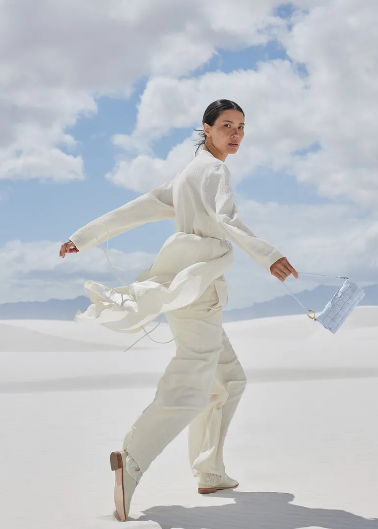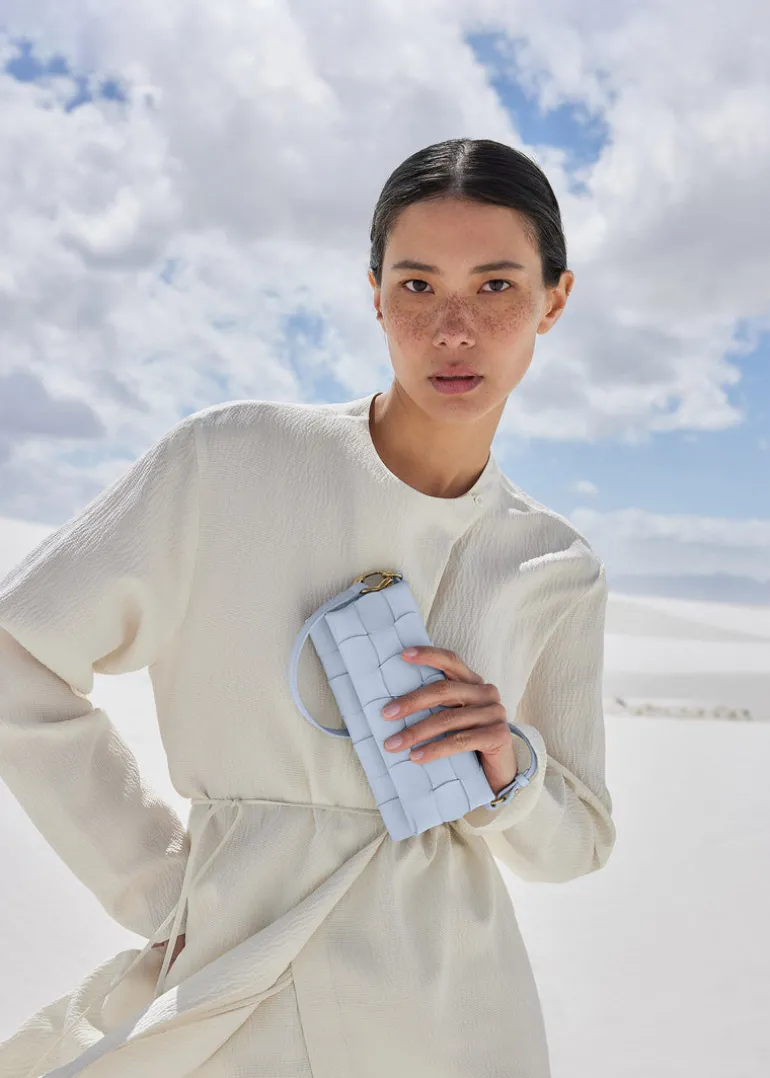 Le modèle Neiti réinterprète une technique iconique de la maroquinerie, le tressage, en l’adoucissant aux travers de lignes ondulées comme des vagues et en entrecroisant des cuirs ton-sur-ton lisse et grainé. Un savant jeu de pliage donne à ce mini-sac sa forme et son volume.