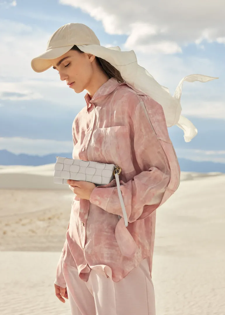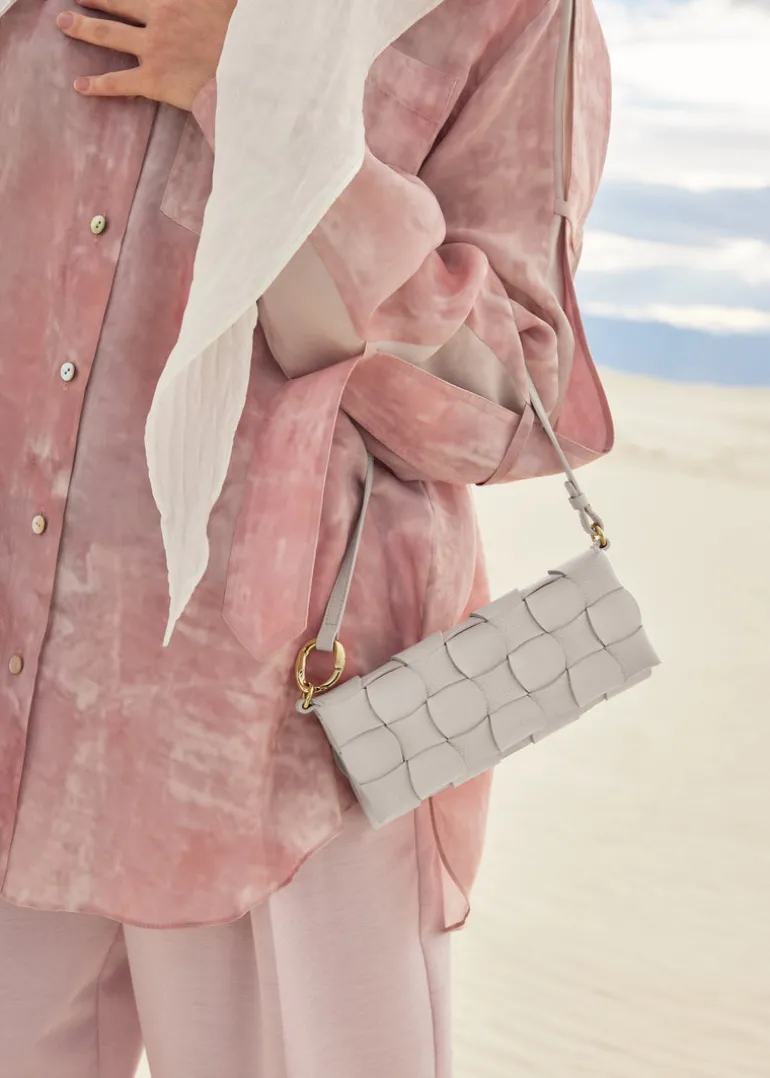 Le modèle Neiti réinterprète une technique iconique de la maroquinerie, le tressage, en l’adoucissant aux travers de lignes ondulées comme des vagues et en entrecroisant des cuirs ton-sur-ton lisse et grainé. Un savant jeu de pliage donne à ce mini-sac sa forme et son volume.