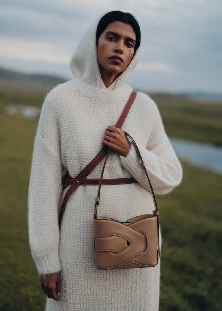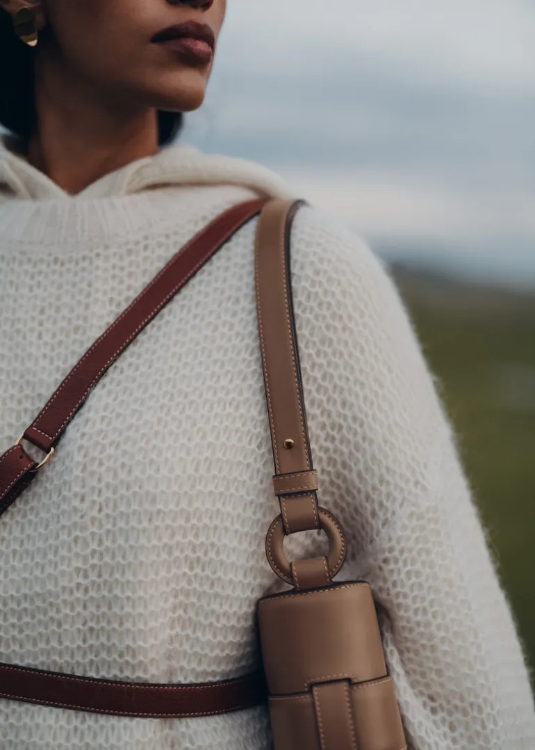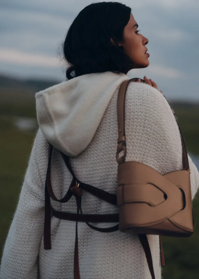 Composé de deux modules de cuir identiques qui s’entrecroisent, le modèle « Nodde » est un sac aux lignes entrelacées, soulignées par des coutures minutieuses, formant une symétrie parfaite.