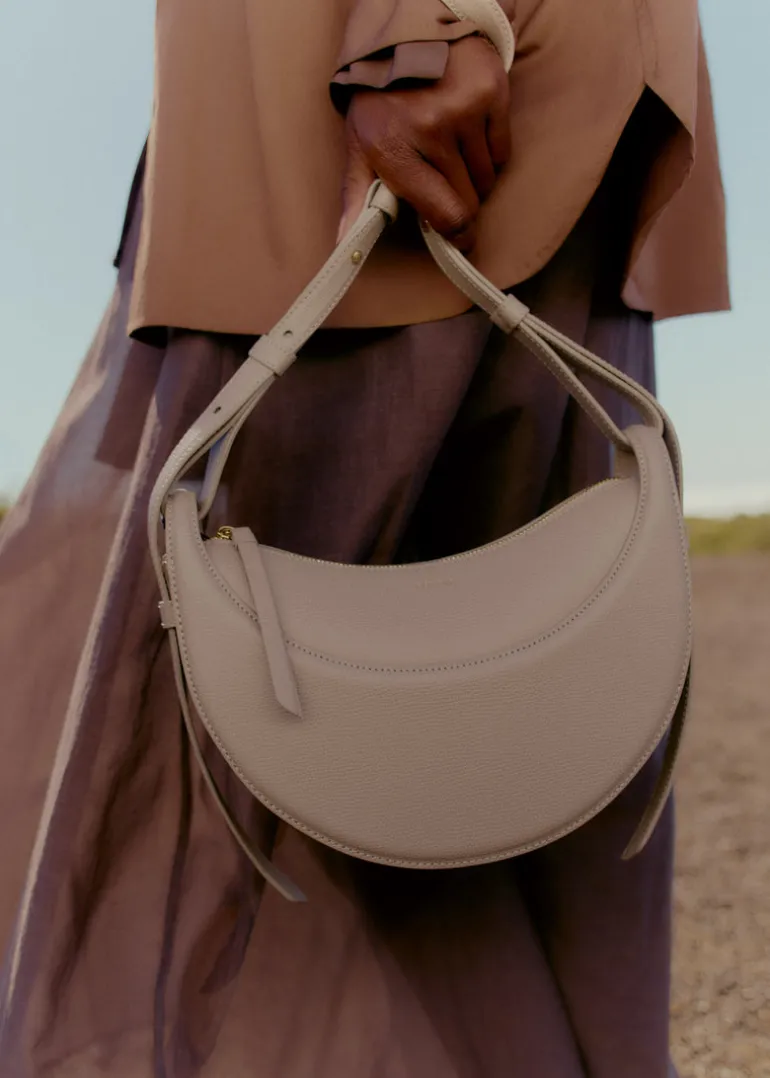 Avec sa forme bombée, son garnissage avec mousse et ses points cousus à la main, le « Numéro Dix » s’inspire des codes équestres de la sellerie. Son design demi-lune joue sur la juxtaposition de courbes.