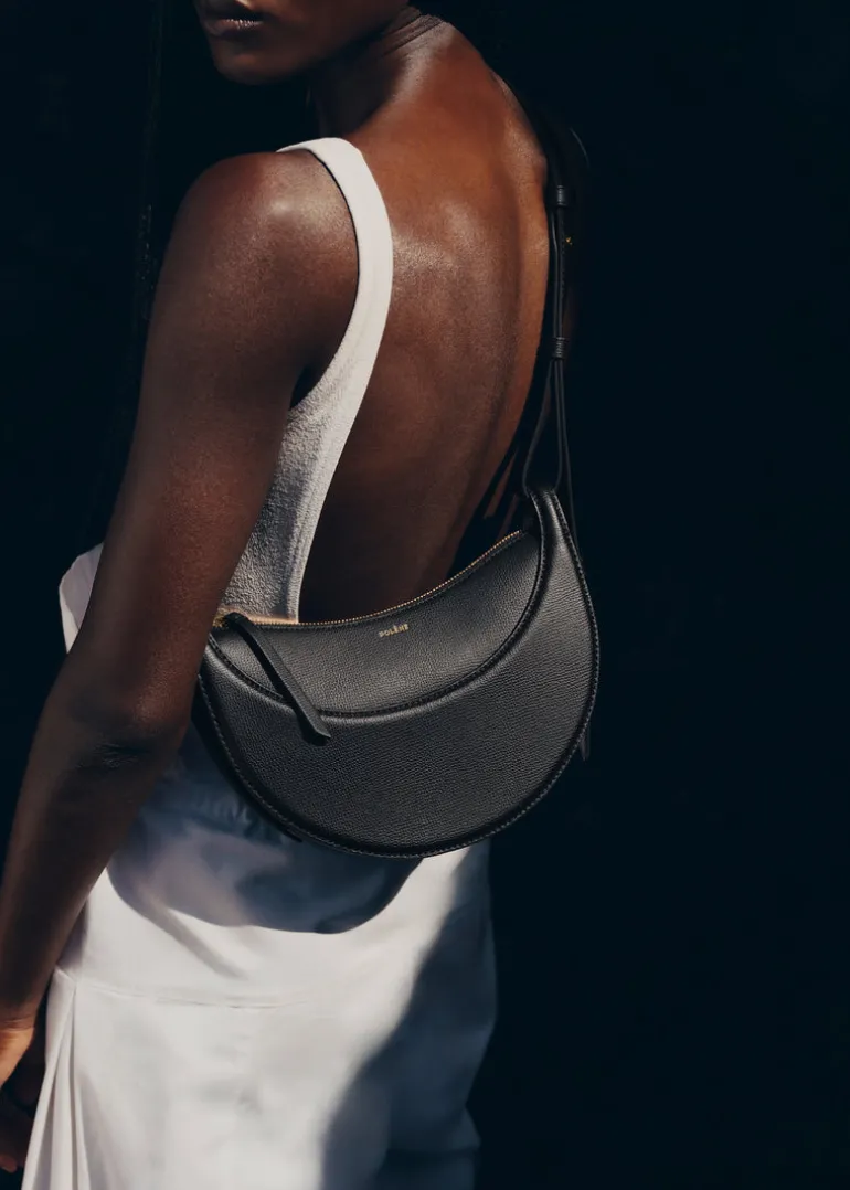 Avec sa forme bombée, son garnissage avec mousse et ses points cousus à la main, le « Numéro Dix » s’inspire des codes équestres de la sellerie. Son design demi-lune joue sur la juxtaposition de courbes.