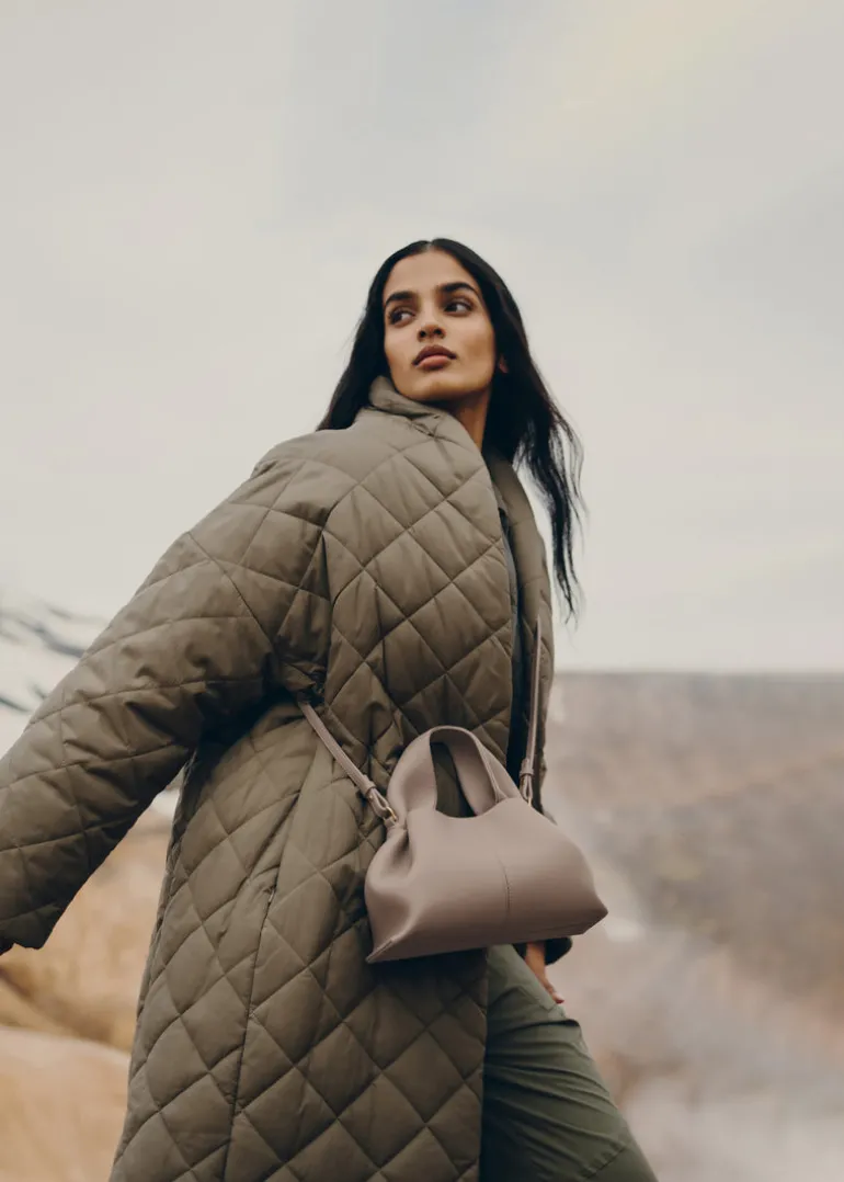Pièce au design organique, le « Numéro Neuf Mini » est à l’équilibre entre souplesse et maintien. Le cuir, travaillé en drapé, est retenu par des points cousus à la main.