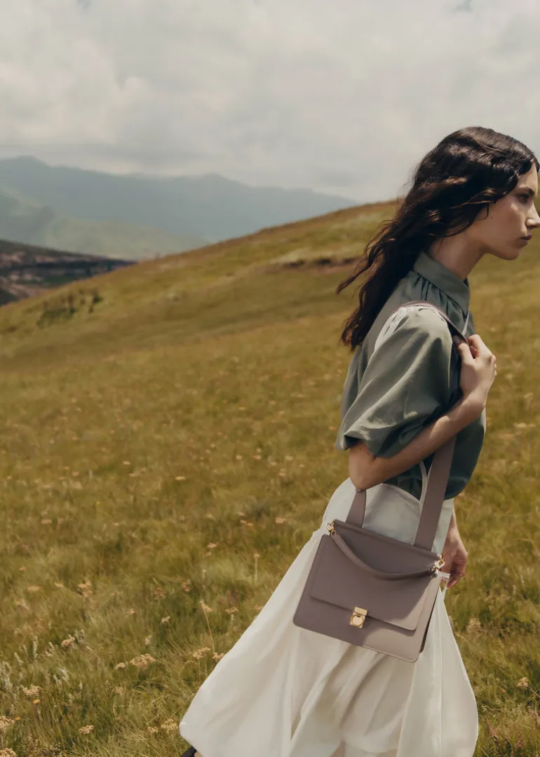 Modèle à l’apparence structurée, le design du « Numéro Sept » associe au cuir un travail de bijouterie de sac soigné avec son fermoir signature et ses mousquetons gravés Polène.