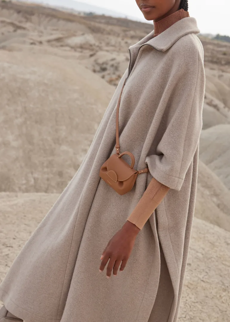Réalisé à partir de chutes de cuir, le « Numéro Un Micro » miniaturise en détail le modèle iconique de Polène : plis, languette demi-lune, clous de fond et poche plaquée au dos.