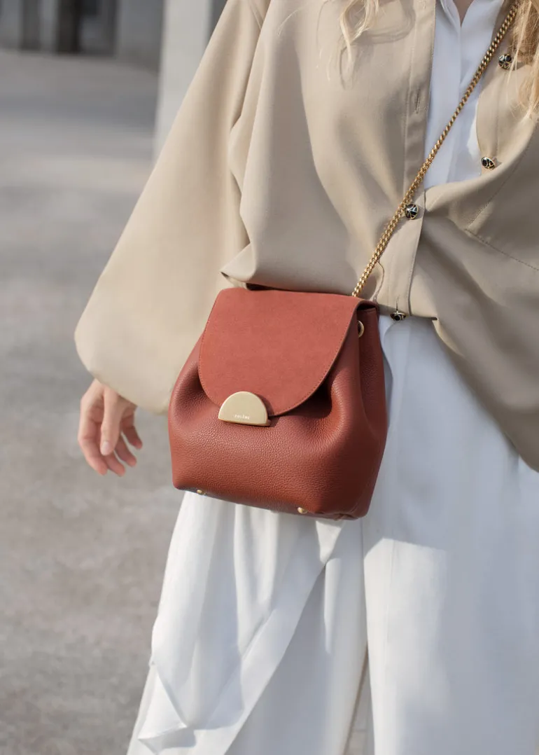 Réinterprétation du modèle iconique de Polène, le « Numéro Un Mini » joue sur la dualité du cuir et de l’or avec sa chaîne et son fermoir brossé.