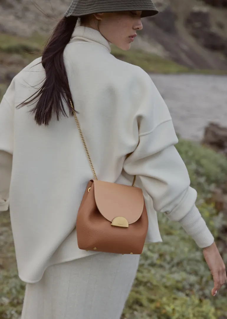 Réinterprétation du modèle iconique de Polène, le « Numéro Un Mini » joue sur la dualité du cuir et de l’or avec sa chaîne et son fermoir brossé.