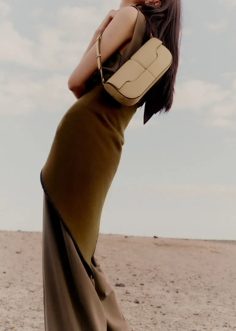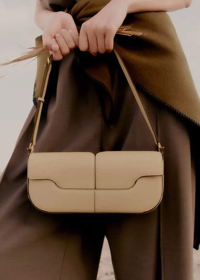 Fermé par un rabat, cet écrin est coupé dans un cuir de veau lisse, nappa. Réputé pour sa beauté naturelle et son toucher singulier, il revêt l’intérieur et l’extérieur du sac. La bandoulière réglable permet un porté court, « baguette ».