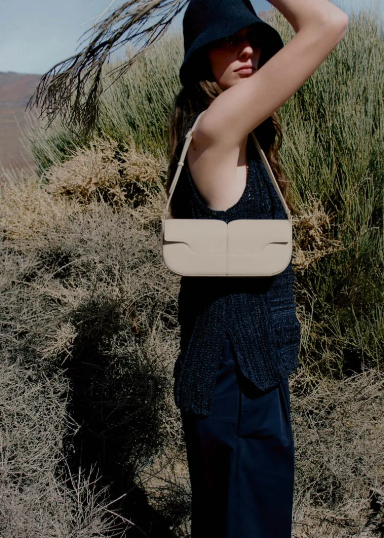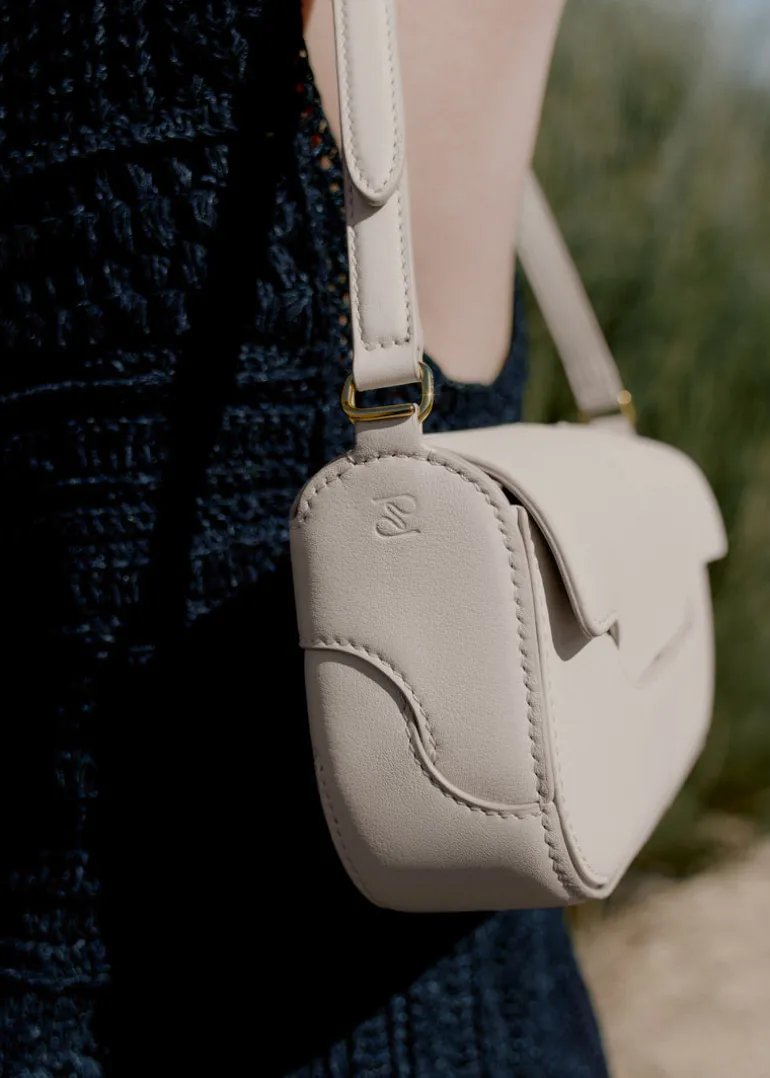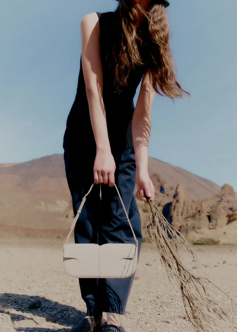 Fermé par un rabat, cet écrin est coupé dans un cuir de veau lisse, nappa. Réputé pour sa beauté naturelle et son toucher singulier, il revêt l’intérieur et l’extérieur du sac. La bandoulière réglable permet un porté court, « baguette ».