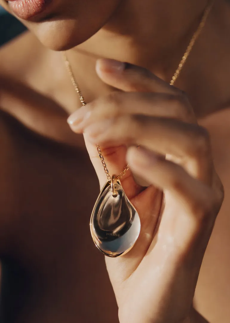 Un pendentif retenu par une fine chaîne superpose une goutte sculptée dans le verre et une plaque en laiton dorée, dévoilant par transparence le logo Polène gravé dessus.