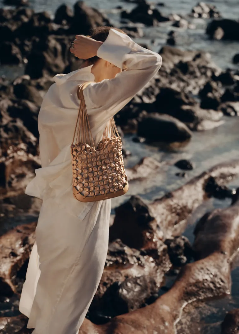 Issu de la collection Plèi qui met au centre du jeu l’upcycling des chutes de cuir, le modèle « Solé » mêle innovation et artisanat. Fabriquées en France, les 240 perles, au design inspiré des galets, sont moulées à partir de chutes de cuir issues des collections Polène. Enfilées sur des cordons de coton ciré, elles sont retenues par 120 nœuds faits à la main selon la technique artisanale du macramé. Ce sac, d’inspiration filet, est réhaussé de détails maroquiniers avec son fond et sa poignée en cuir lisse surpiqué.